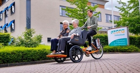 Der Chat wurde entworfen, weil der Gründer von Cycling withouth Age (CWA) zusammen mit Van Raam dachte, dass die aktuellen Rikscha Fahrrräder modernisiert werden könnten. Van Raam griff dies auf, und von hier stammt auch das elektrische Rikscha Fahrrad Chat. CWA nennt den Chat jetzt die Rolls-Royce der Rikschas und die Organisation nutzt den Chat bereits sehr häufig. Lesen Sie mehr über Radeln ohne Alter in dem Artikel “Van Raam Rikscha Fahrrad Chat mit großer Wirkung“. Lesen Sie mehr über den Chat in Amerika, indem Sie auf den Button klicken.