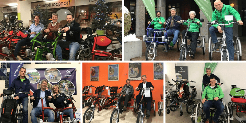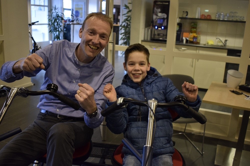 Zusammen mit seiner Mutter und zwei Freunden besuchte er vanRaam vor einiger Zeit. Bei seinem Besuch hat er sich die Fabrik angesehen, wo unsere Fahrräder hergestellt werden. Natürlich darf ein Foto mit Martijn, dem Fotografen von "vanRaam On Tour", nicht fehlen. Die Begeisterung wird ausgestrahlt auf dem Foto, von Martijn, Niek und seinen beiden Freunden, die in unserem Showroom auf dem Fun2Go Duorad und FunTrain Duorad Anhänger Platz nehmen.