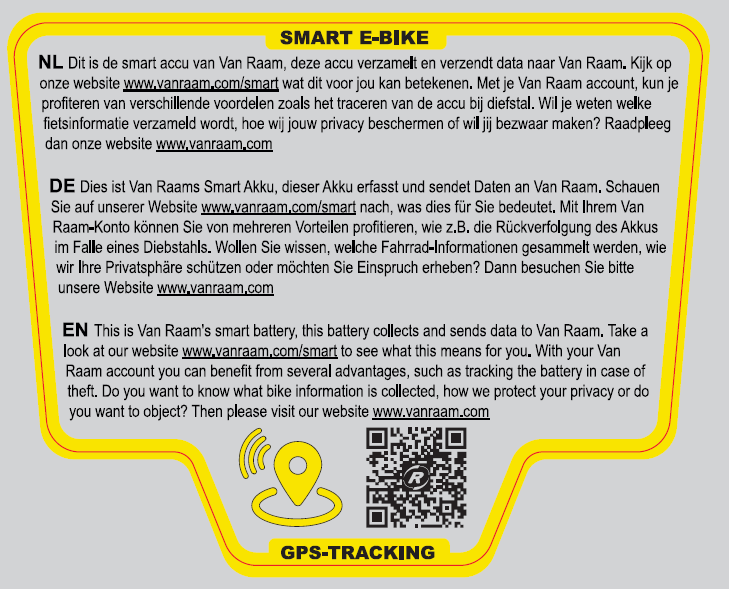Si vous aviez une batterie Smart , vous pouviez la connecter à l'application. Une bicyclette électrique Van Raam avec une batterie intelligente se reconnaissait à l'autocollant GPS large avec une bordure jaune sur la batterie du vélo. Toutes les bicyclettes Van Raam avec assistance électrique ne disposaient pas d'une batterie Smart (intelligente), même si elles étaient des vélos électriques intelligents. Si vous aviez un vélo sans assistance électrique, vous n'aviez pas de vélo électrique intelligent.