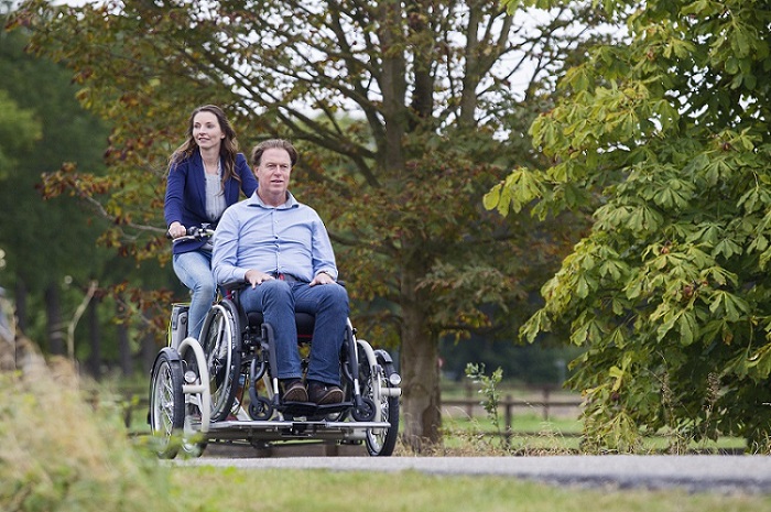 De Van Raam VeloPlus rolstoelfiets is een fiets waar op de voorkant een rolstoel geplaatst kan worden. Hierdoor kan een rolstoelgebruiker samen met een bestuurder weer genieten van mooie fietstochten. De rolstoel kan zonder veel krachtinspanning op het kantelbare plateau gereden worden en hier door middel van de rolstoelvergrendeling vastgezet worden. Het voordeel van de VeloPlus rolstoelfiets is dat de rolstoelgebruiker zijn eigen rolstoel niet uit hoeft en toch stabiel en veilig op de fiets zit.