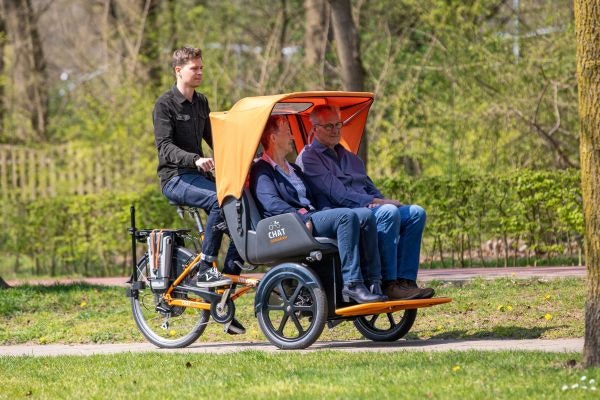 De Chat Riksja driewieler is ontworpen om samen met een of twee personen te fietsen die niet meer zelfstandig aan het verkeer kunnen deelnemen. Een begeleider fietst en twee personen kunnen voorin zitten. De passagiers zitten in een speciaal ontworpen cockpit. Doordat de bestuurder achter zit heeft deze een goed overzicht over de weg, de riksja fiets en de passagiers. De passagiers kunnen hierbij ongestoord genieten van de omgeving.
