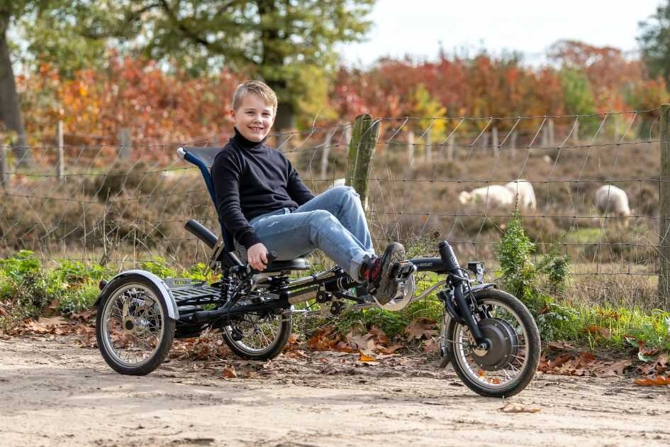 Door de vering in het frame en de zitting met rugsteun heb je goed fietscomfort. De voorwaartse trappositie en de liggende fietshouding dragen hier aan bij. Het onderstuur zorgt dat je rug, nek, schouders en polsen minder worden belast. Dit zorgt ervoor dat fietsen comfortabeler is. Ook op- en afstappen is erg eenvoudig door de lage instap van deze fiets. De ligdriewieler heeft voor en achter 16” wielen, een kleine zitting (zitting maat M) en korte cranks.